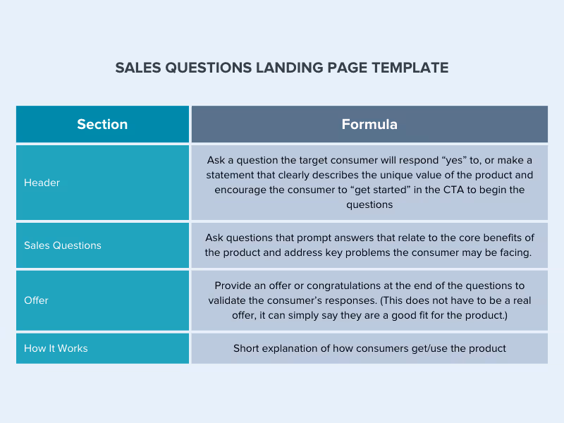 The Q&A style template asks questions that prompt the user to say “yes” and reinforce the value of the product.